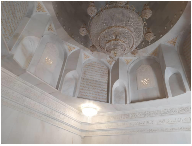 All the architectural elements – from the four entrance doorways, the corbelled cornice at roof level, the semicircular dome, the gilded interiors, including the signature element at the four corners of the roof – were scaled down and reproduced in this far away corner. The stark simplicity of the glowing white marble facades, in a rugged and rustic brown setting, make further embellishments unnecessary. Where it differs from the original is in the front annexe, where an elegant room has been attached along one side. Its presence has been deliberately downplayed by a low flat ceiling so that the majesty of the dome remains unhindered.