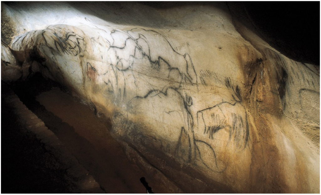 Cave art in Pech Marle, France. The painting of the punctuated horses is a unique composition, a masterpiece exceptionally preserved for 29,000 years.