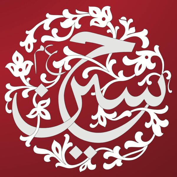 This verse-fragment is composed here as a mirror image barring the word bi-Allah, which is written just once in testament to the oneness of Allah Subhanahu. Silver on magenta accentuates the stylistics of this elegant, calligraphic work.