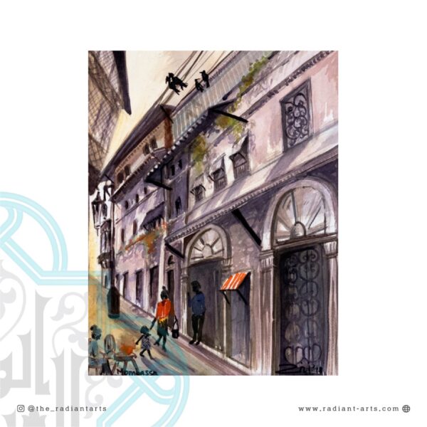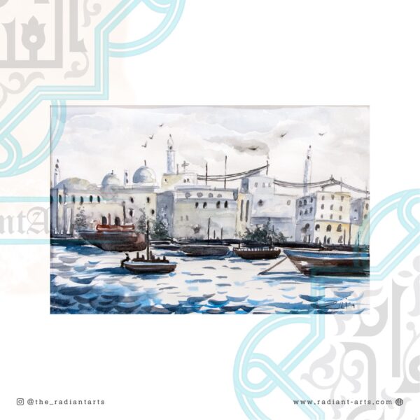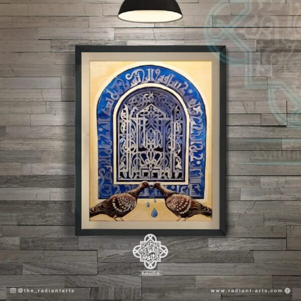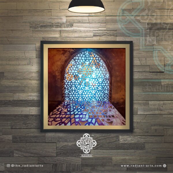 This painting depicts the sublime rotated square, which boasts reflective symmetry on multiple axes, adorns the monumental portal of al-Jami al-Anwar. It was recreated from remnants of an original square that was preserved on a recessed wall panel in the form of a blind niche on the north-eastern side of the portal. This recessed panel came to light in 1324/1907 due to conservation work undertaken on the faƧade of this Jami masjid. This discovery further established that Maulana al-Imam al-Hakim AS deliberately chose to emphasize the main entrance to the masjid through the use of a projecting portal and also highlighted its significance through detailed ornamentation. Today, the monumental portal of al-Jami al-Anwar stands resplendent due to the accomplishments of His Holiness Dr Syedna Mohammed Burhanuddin RA and his successor, His Holiness Dr Syedna Mufaddal Saifuddin TUS. (Adapted from information extracted from pages 284-94 of āal-Jami al-AnwarāThe Luminous Masjidā)