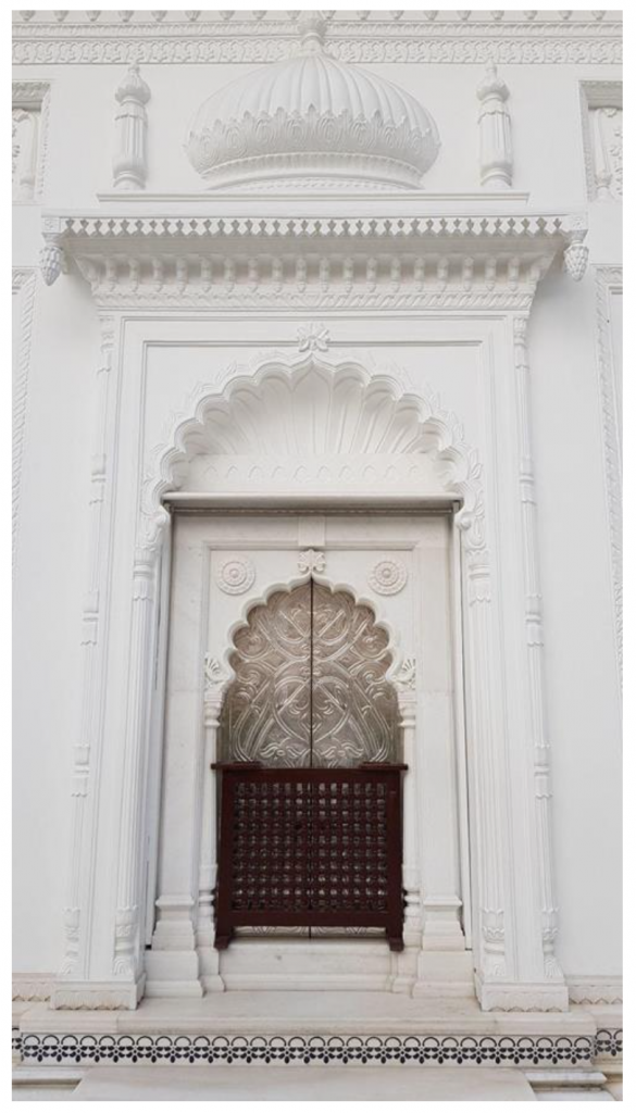 Next it‟s the buttery exterior walls that rivet the eye; satin smooth and water repellent. The bas-relief arches with carved ventilators above give a misleading impression of having been bricked up. While the ornamental columns at the four corners, despite making no structural contribution, give each facade a visually contextual framework.The entrance doorways in the four cardinal directions, with their lustrous silver shutters, are at once dignified and majestic. Framed by cusped arches, they are fit enough for regal entry. The design of a cusped arch (sometimes referred to as scalloped or multi foliated arch) involves complex geometry and is, by far, the most difficult arch to design. But once completed there are hardly any other architectural features that can compete with it from an aesthetic viewpoint.