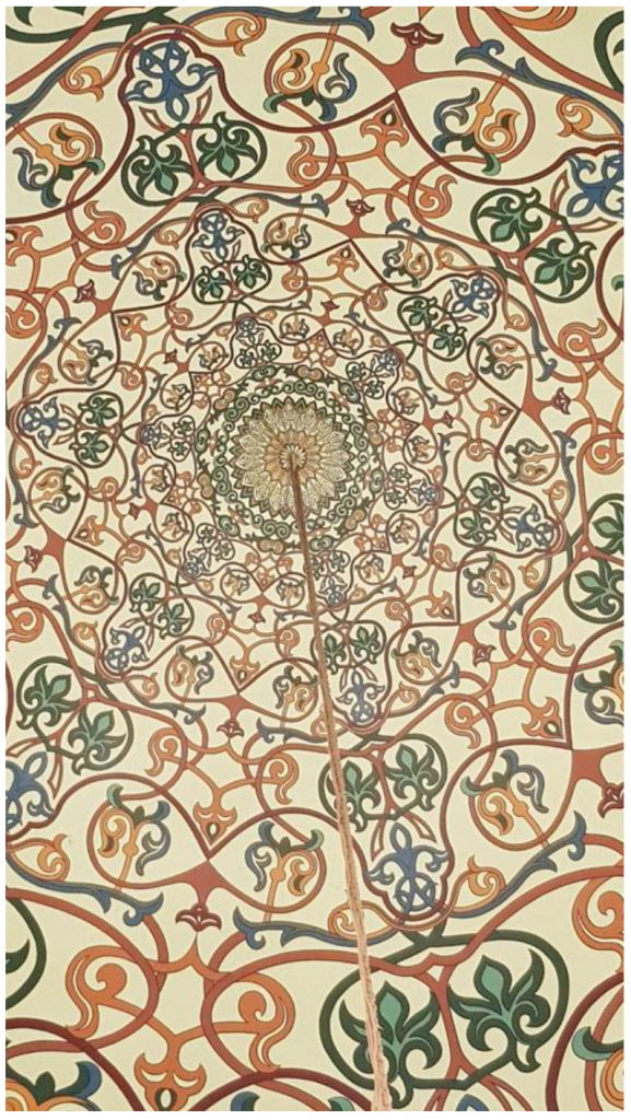 The interior walls have the same buttery and smooth finish and colour as the external walls; with a niche here and there in the massive walls to accommodate little lamps. The effect of the squinch, mentioned earlier, can be seen in the drum above. Each of the eight corbels have an elegant Mishkat lantern strung from its soffit.
